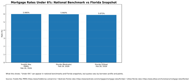 Some borrowers have seen sub-6% Florida quotes in late February 2026 depending on profile and points, while a national benchmark also dipped under 6%. Your actual rate depends on credit, down payment, loan type, and lender pricing.