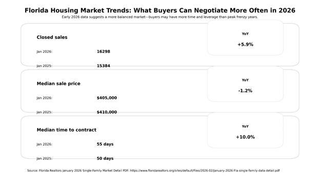 Lower rates can increase demand, but local inventory, affordability, and seller behavior also matter. January 2026 Florida data also showed a longer time to contract and a slightly lower median single-family price year over year.