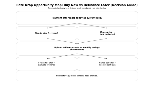 Trying to time rates perfectly is risky. A better approach is buying when the payment works and the home fits your goals, then refinancing later if it truly saves money.